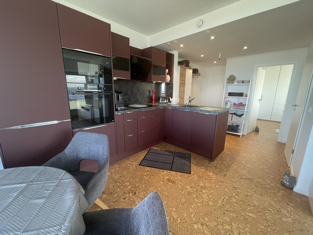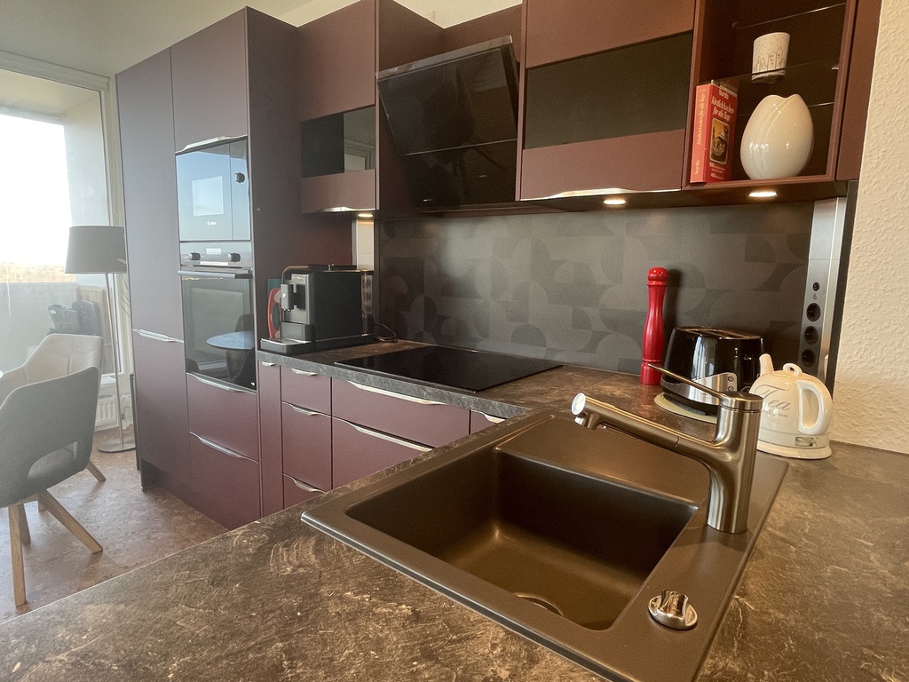 Die bordeauxrote Einbauküche ist mit hochwertigen E-Geräten ausgestattet und bietet einen schönen Kontrast zu den dunklen Arbeitsplatten und der Rückwand.