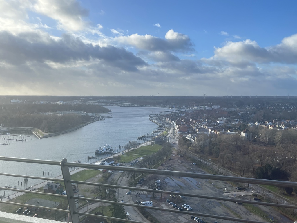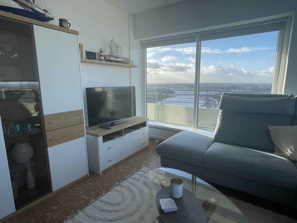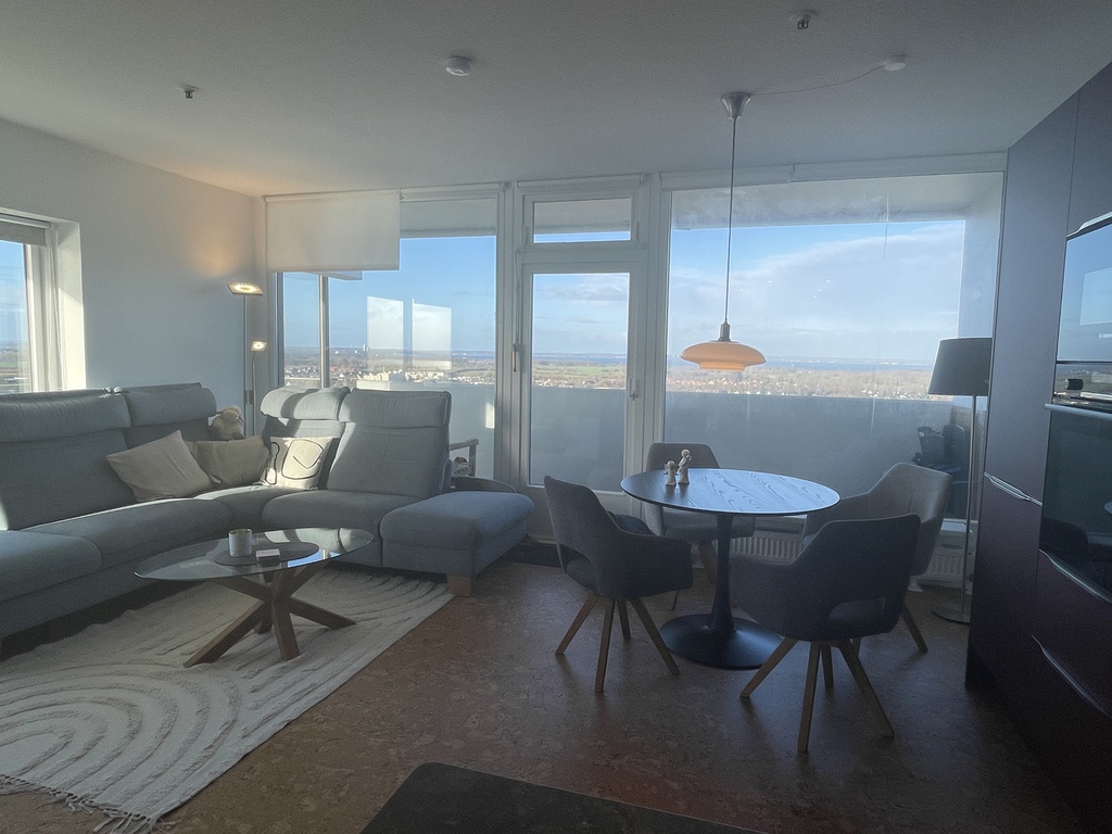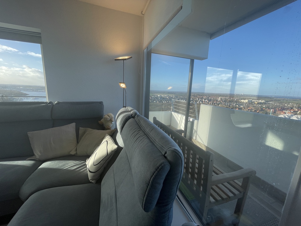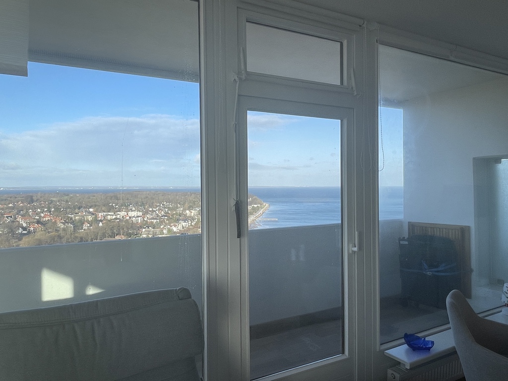 Das lichtdurchflutete, fast komplett verglaste, Appartement ist hoch gelegen und besticht durch den unvergleichlichen, abwechslungsreichen Panoramablick auf die Trave, die Häfen, die Stadt, den