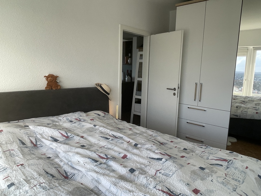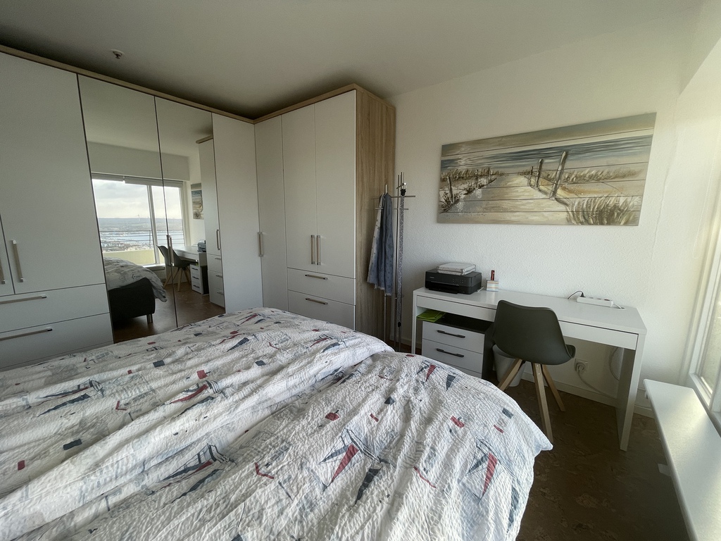 Selbst vom Schlafzimmer aus genießen Sie den unverbaubaren, beeindruckenden Ausblick auf die Trave und die Schifffahrt und die fast bodentiefen Fenster ermöglichen, sogar im Liegen, diesen Genuß.