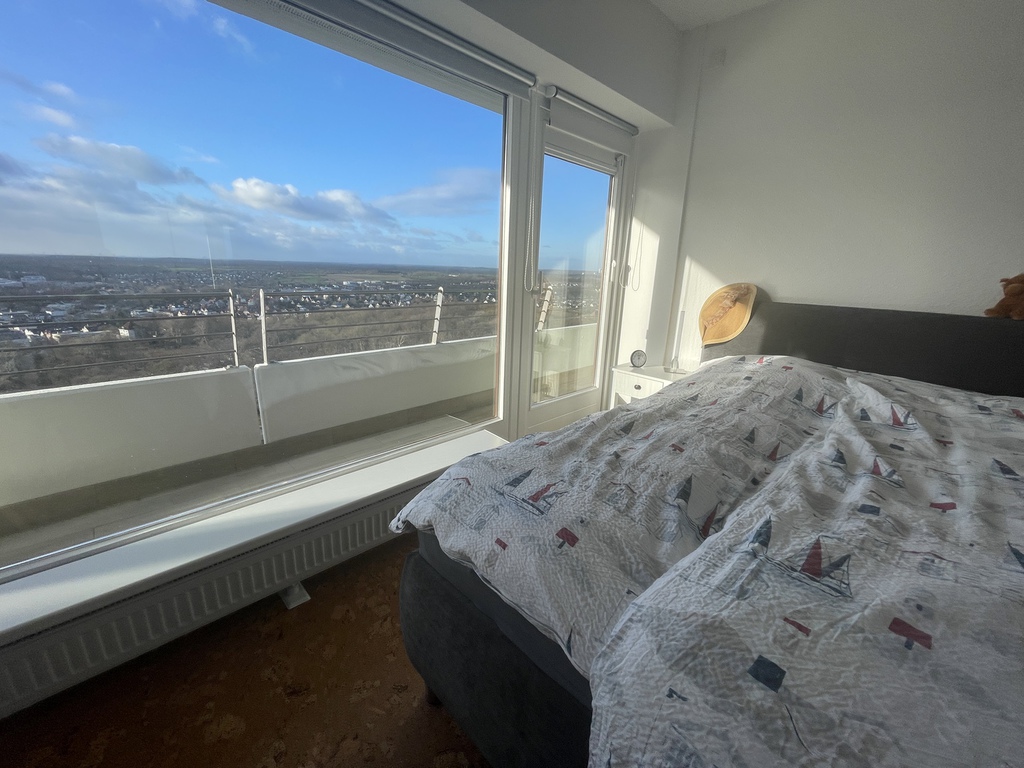 Der umlaufende Eckbalkon ist sowohl vom Wohn-, als auch dem Schlafzimmer zugänglich und ermöglicht stets einen Platz zum Relaxen zu finden. Eine neue, maßgefertigte Glas-Schiebetür kann, bei