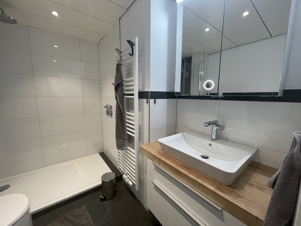 Die Badgestaltung nimmt die harmonischen Farbkomponenten auf und überzeugt mit sehr hochwertigen Badausstattung. Die fast ebenerdige XXL-Dusche und das kombinierte WC-Bidet erhöhen den Komfort. Die durchdachte Neukonzeption beinhaltet den Einbau eines Waschtrockners mit entsprechendem Anschluß.
