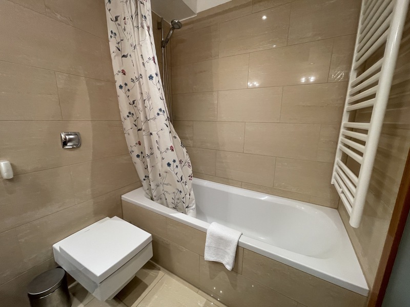 Das Bad ist mit einer Badewanne (niedriger Einstieg) und exklusiven Badmöbeln ausgestattet.