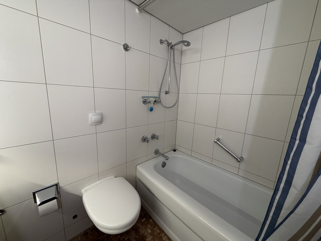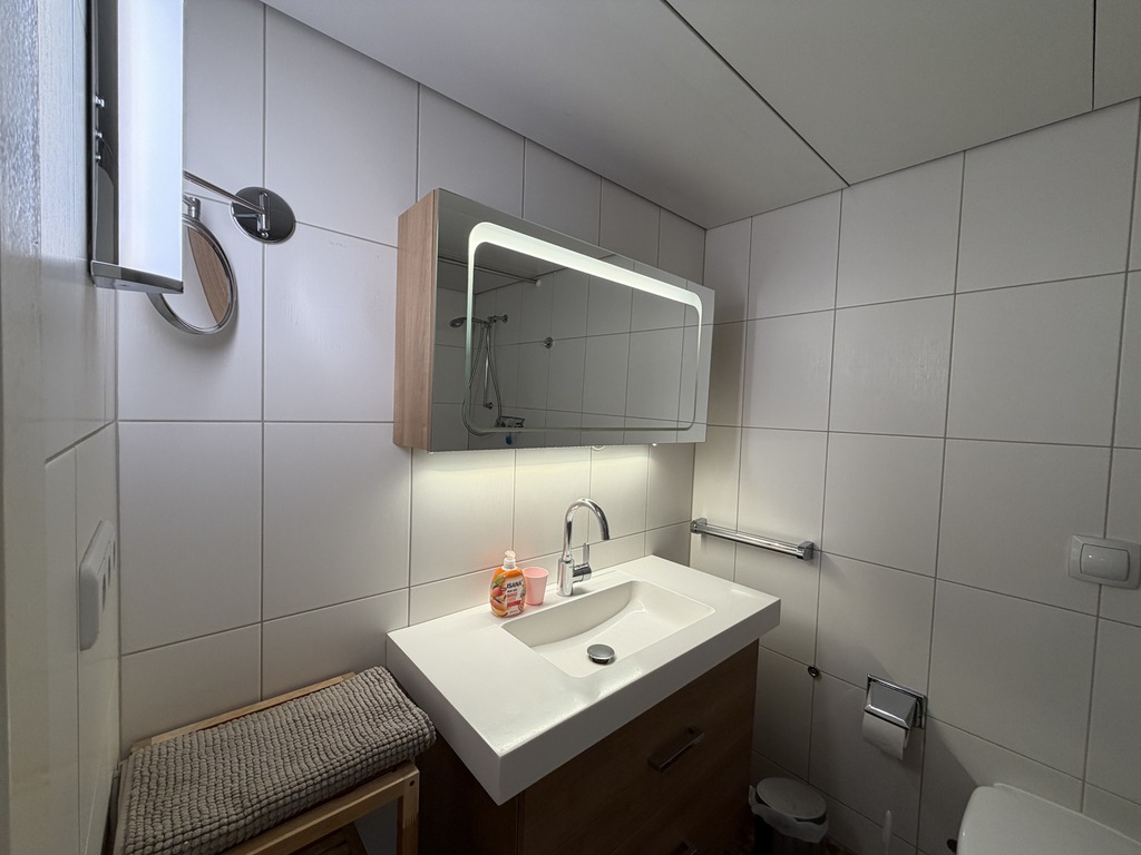 Das Bad ist mit neuen Badmöbeln und einer niedrigen Badewanne ausgestattet, die entspanntes Baden und Duschen vereint.