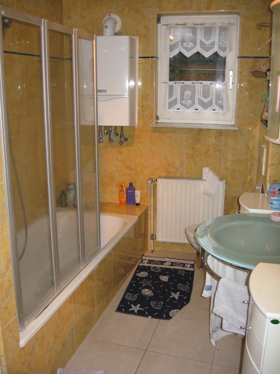in einem warmen Gelbton (Marmorliesen) gefliest und bietet eine Badewanne, Waschtisch, WC und Platz für eine Waschmaschine. Ein Fenster zum Garten läßt Tageslicht einfallen und ermöglicht eine