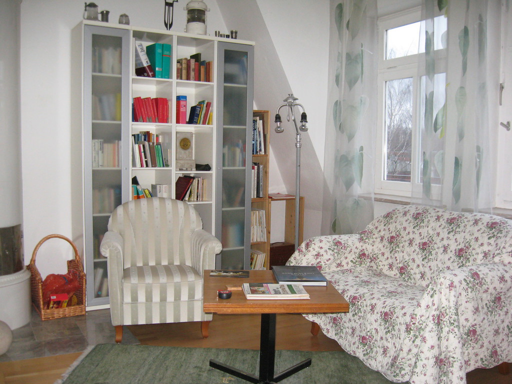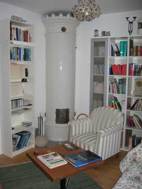 Über eine großzügig bemessene Treppe gelangen Sie in das Obergeschoß. Hier befindet sich das Wohnzimmer, das mit einem historischen, schwedischen Kachelofen versehen ist. Dieser kann, bei Bedarf das