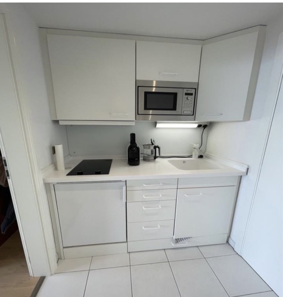 Offene Küche: komplett eingerichtete Küche, 2er Induktionskochfeld, Kühlschrank, Kaffeemaschine, Toaster, Wasserkocher, Geschirr etc.