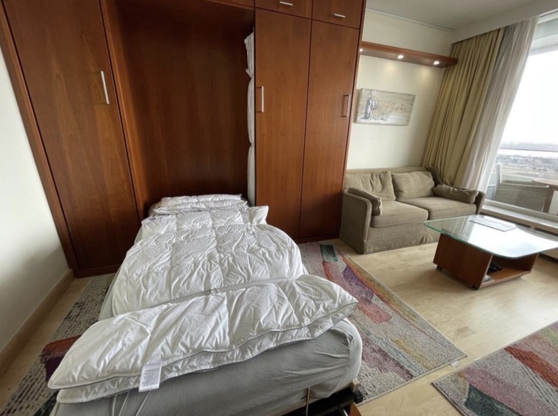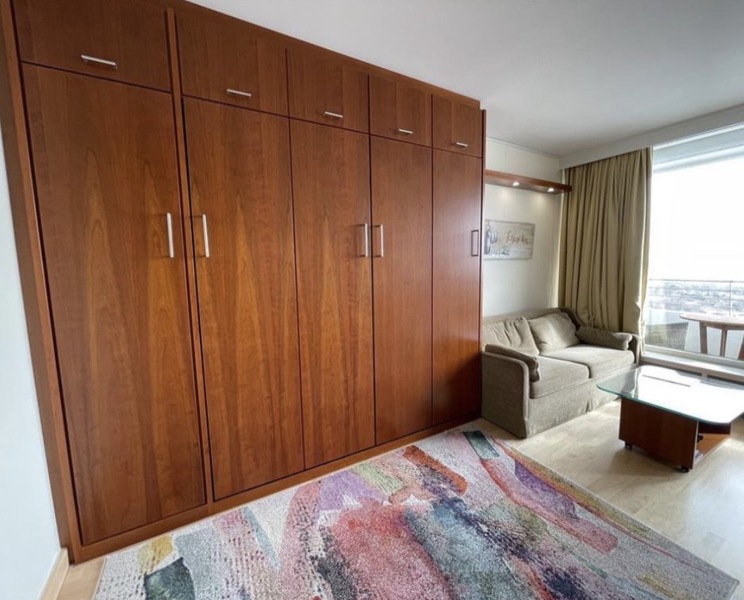 Farblich sehr harmonisch aufeinander abgestimmt strahlt das Appartement Ruhe, Leichtigkeit und Geborgenheit aus und bietet tagsüber, wenn die beiden Schrankbetten hoch geklappt sind, einen sehr großzügigen  Wohnbereich. Der Kleiderschrank bietet große Staumöglichkeiten und wurde leicht schräg konzipiert um dem Raum mehr Tiefe und geben und gleichzeitig den Grundriss auf zu lockern. Der Schrank und die gegenüberliegen Schrankbetten wurden von einem Tischlerbetrieb, in Kirsche-Echtholz gebaut.