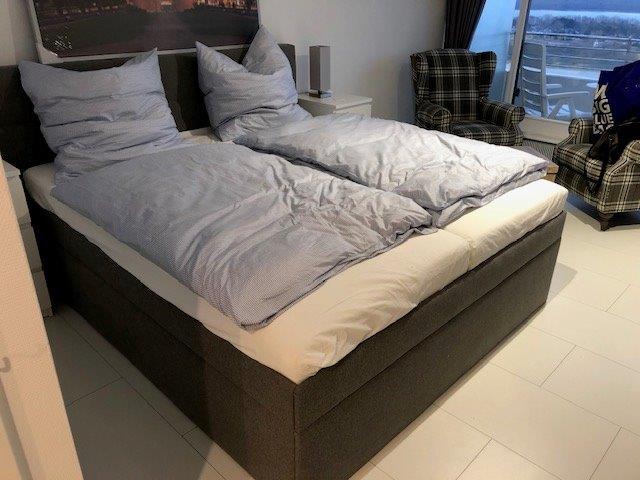 Das komfortable Polster-Doppelbett bietet zusätzlichen Stauraum und unterstreicht den modernen und gradlinigen Charakter der Wohnung. Sowohl vom Bett, als auch der Sitzecke am Fenster können Sie