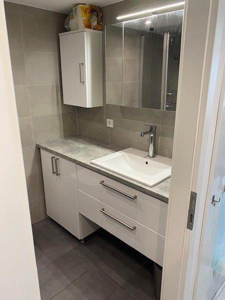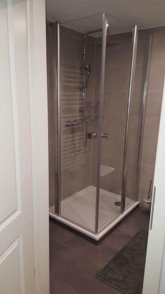 Bad: modernes Bad mit Dusche ( Glasabtrennung,) Waschbecken und WC. Eine Waschmaschine ist in die Waschtischanlage integriert.