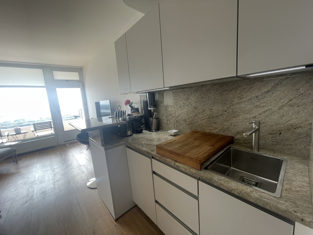 In den Wohnraum wurde eine kleine Einbauküche mit einem Granit-Tresen, der Platz für 2 Personen bietet, integriert. Die neuwertige Einbauküche wurde maßgefertigt eingebaut und bietet, auf kleinem
