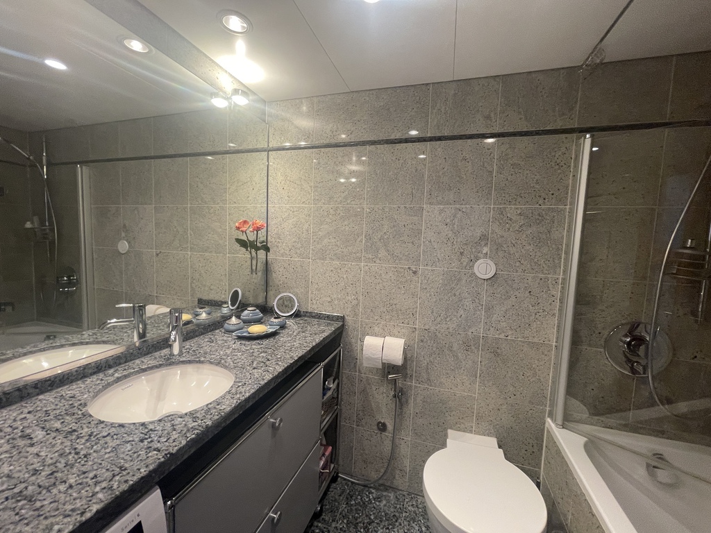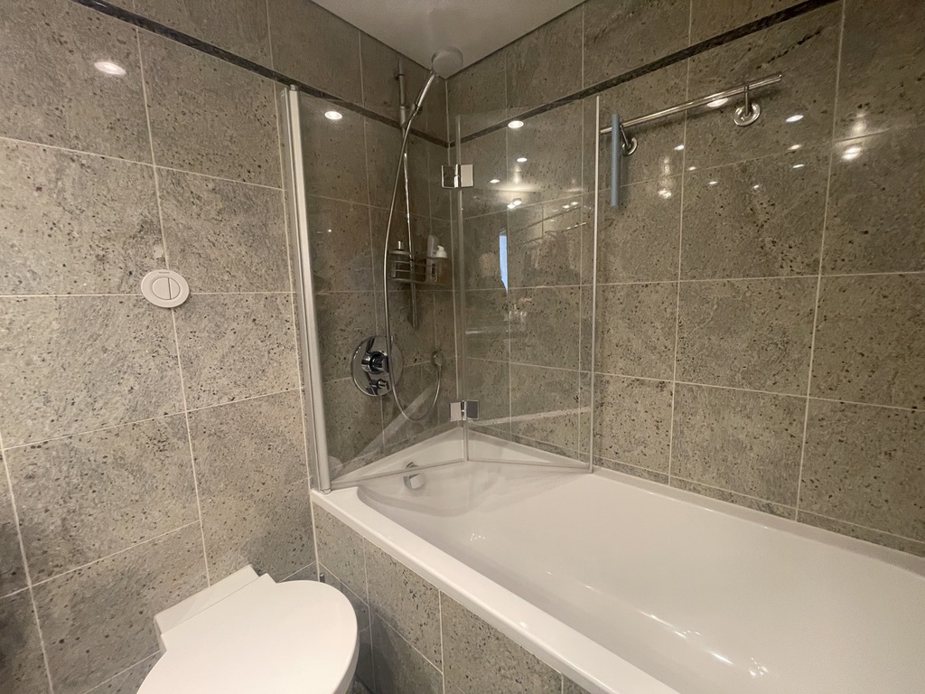 Den Kleiderschrank finden Sie im Eingangsflur. Von hier aus betreten Sie das elegante Bad, das über eine niedrige Badewanne verfügt und mit Granitplatten gefliest ist. Selbstverständlich verfügt das