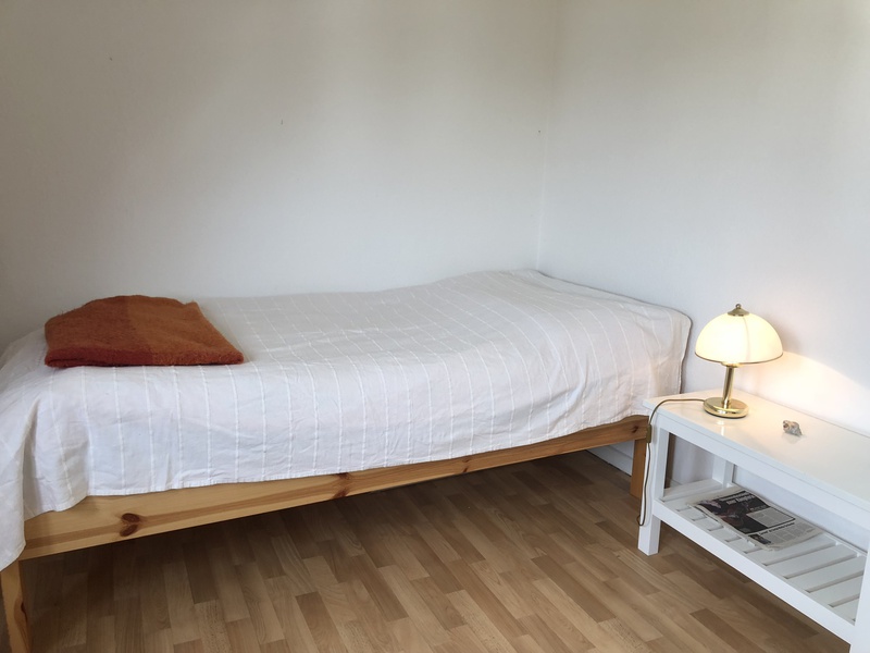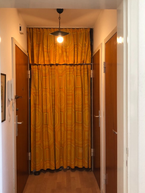 Der Wohnungsgrundriss umfaßt ein großes Zimmer, eine kleine Küche, ein Duschbad und einen Flur mit abgetrenntem Abstellraum. Alle Zimmer verfügen über Fenster, die zum Garten hinausgehen und dieser