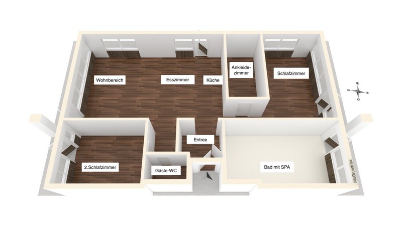 der in der Wohnung, mit Ausnahme des SPA-Bereichs und des 2. Schlafzimmers, verlegt wurde und die Großzügigkeit dezent unterstreicht.