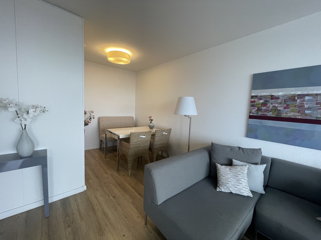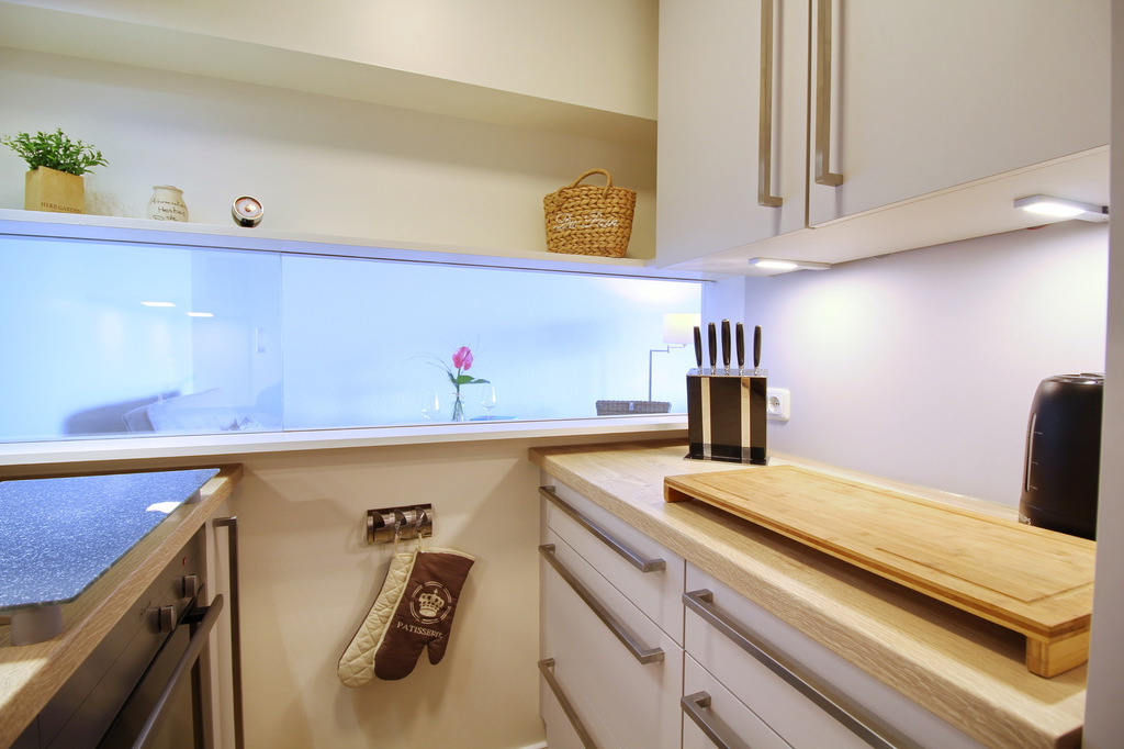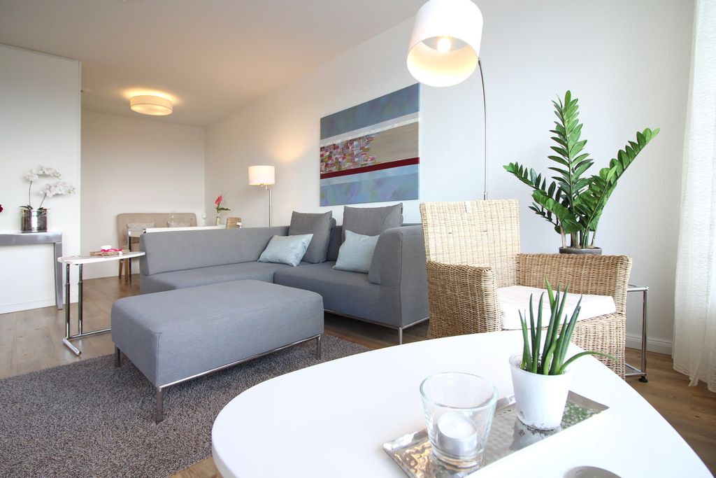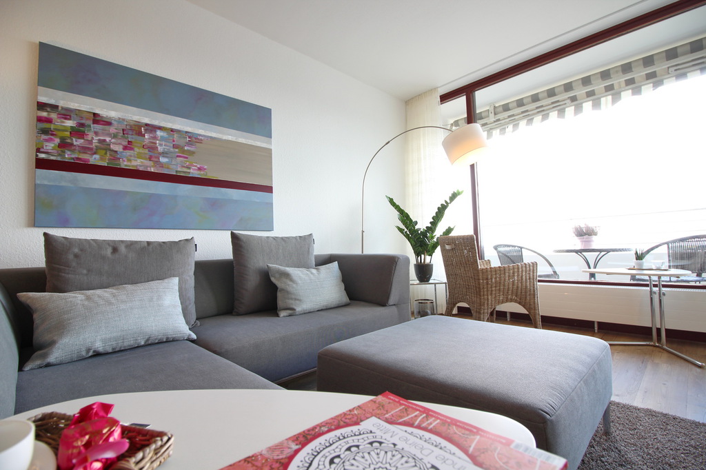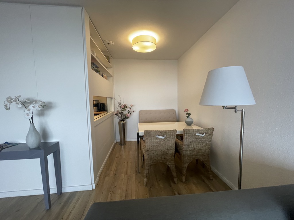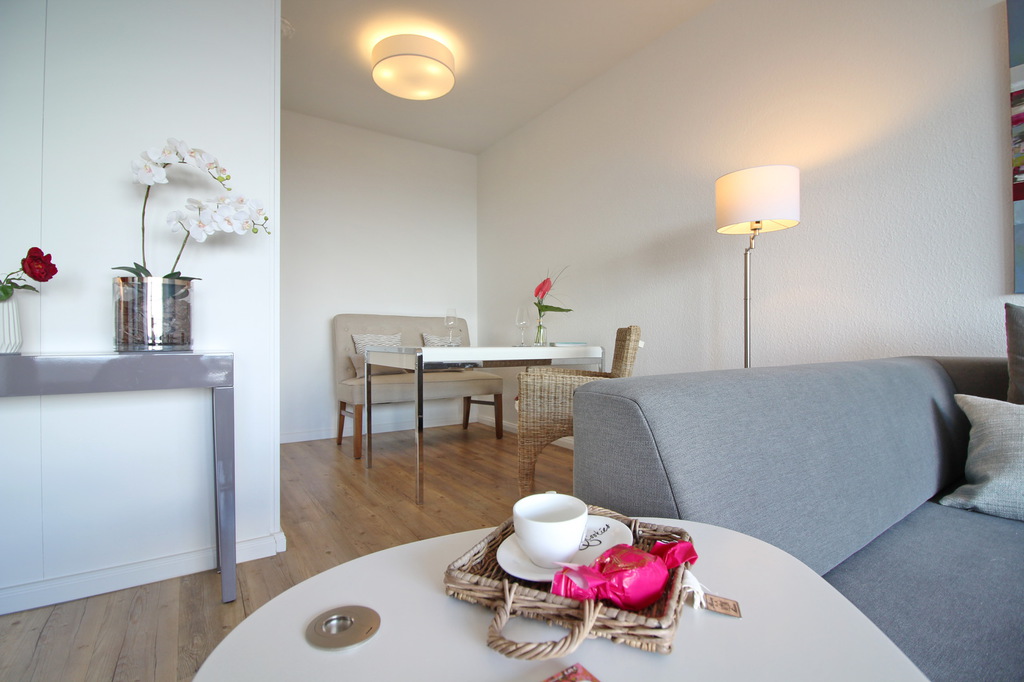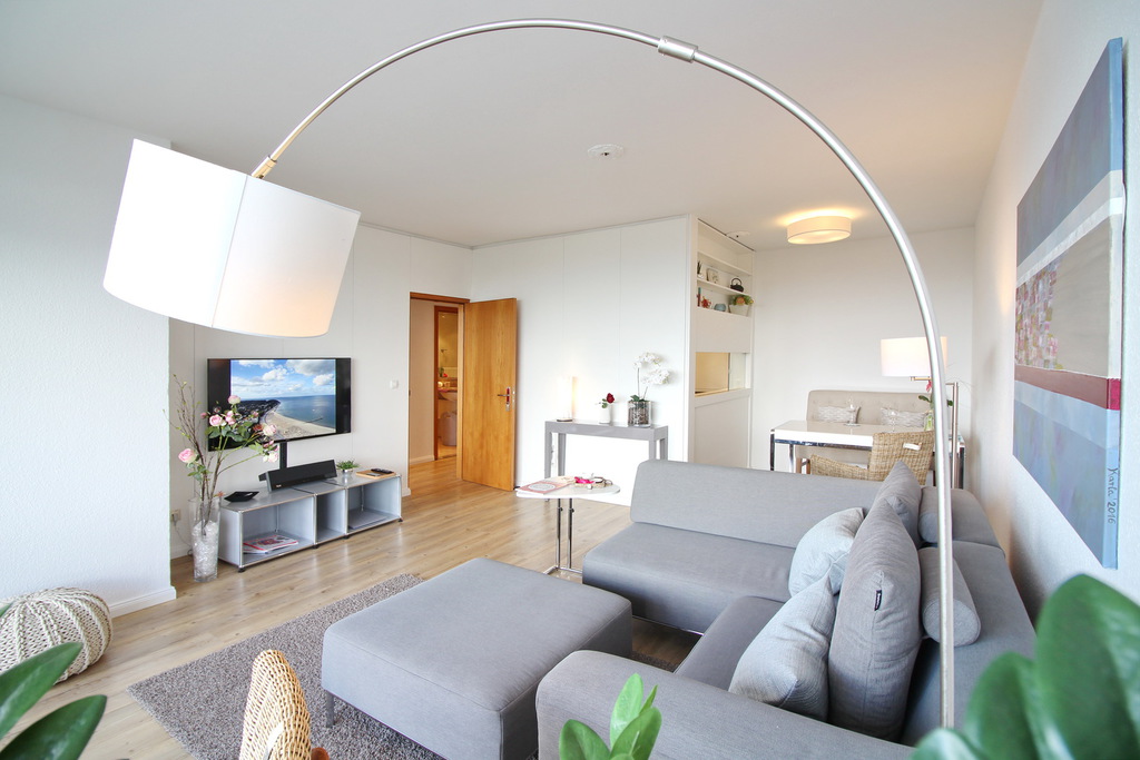 Modern und luftig gestaltet präsentiert sich diese 2-Zimmer-Wohnung, als Rückzugsort am Meer. In das helle Wohnzimmer wurde der Essbereich integriert. Praktisch ist die offene Durchreiche, die