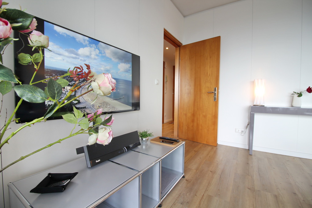 Die fast bodentiefe Fenstnerfronten im Wohnzimmer und im separaten Schlafzimmer geben den unverbaubaren Blick auf den Strand und die Lübecker Bucht frei. Von beiden Zimmern haben Sie Zugang zu dem