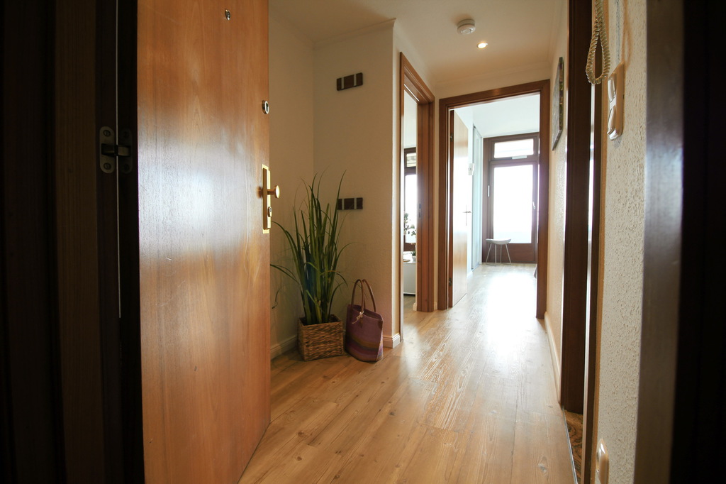 Die Wohnung ist durchgehend mit einem pflegeleichten, gut gedämmten Designbelag, in heller Holzoptik, ausgelegt.