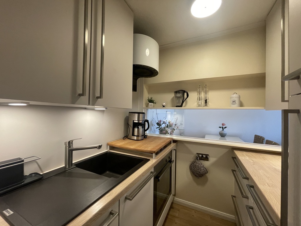 Modern und gut ausgestattet ist die Einbauküche mit hochwertigen-E-Geräten. Großzügig bemessene Arbeits- und Stauflächen ermöglichen es auch aufwändigere Menüs zu zu bereiten.