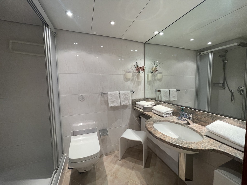 Das Duschbad ist sehr komfortabel mit einer Dusche, einem großen Marmor-Waschtisch und einem Duravit-SensoWash-WC ausgestattet, das höchsten Ansprüchen an Komfort und Hygiene gerecht wird.