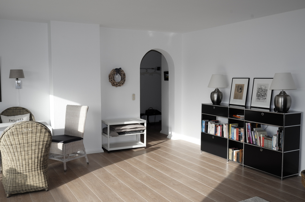 Ein durchgehend verlegter Dielen-Fußboden in Beachhouse-Optik unterstreicht den hellen, leichten Charakter der Wohnung.