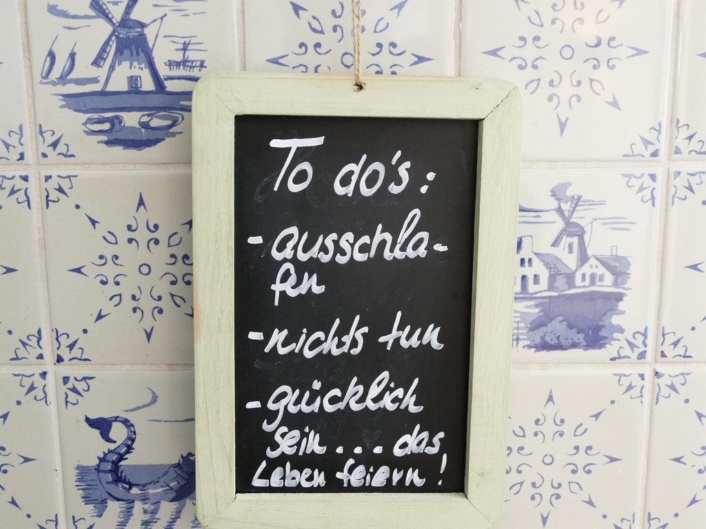 Die weiße Einbauküche ist maritim gestaltet und blau-weiß gefliest.
