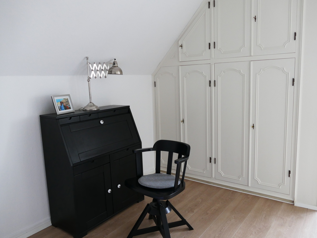 Schlafzimmer und Küche haben leichte Dachschrägen. Das Duschbad ist vom Schlafzimmer aus begehbar und kann über das Fenster gelüftet werden.