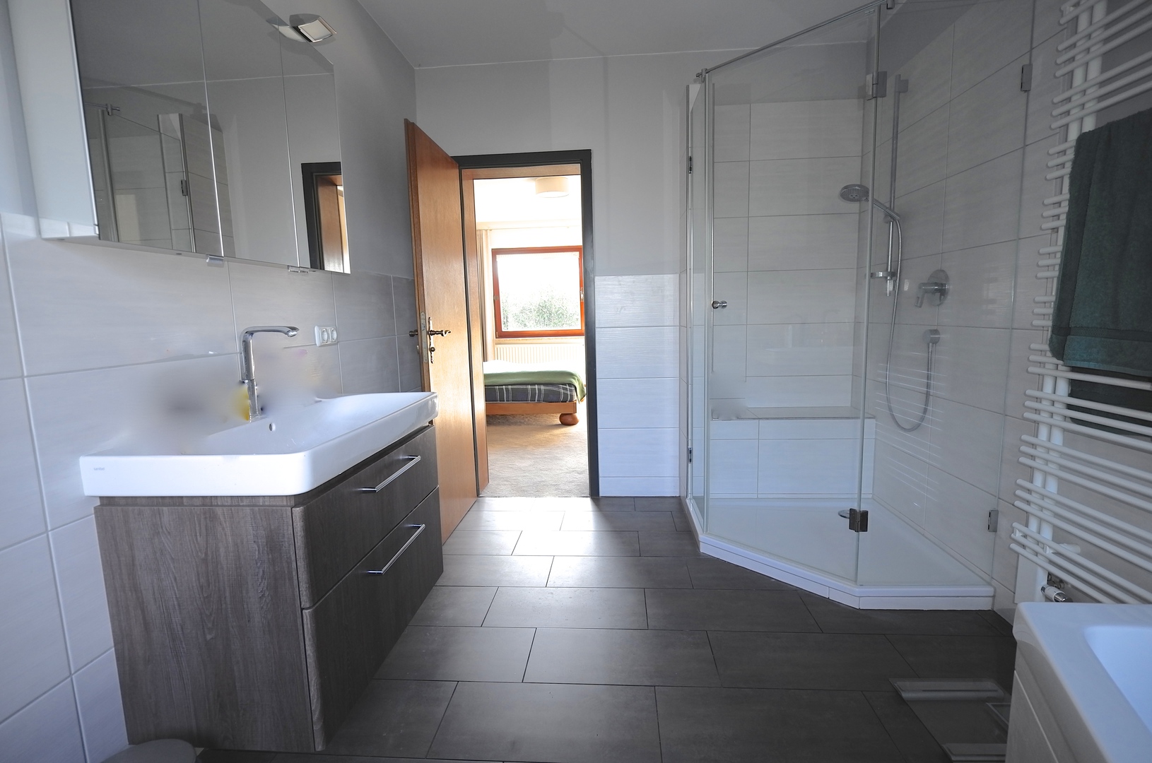 Badezimmer befinden sich sowohl im Erd- als auch im Obergeschoss. Insgesamt verfügt das Haus über 6 Zimmer plus Wohnküche. Auf der oberen Etage befindet sich ein zweites helles Wohnzimmer. Auch von
