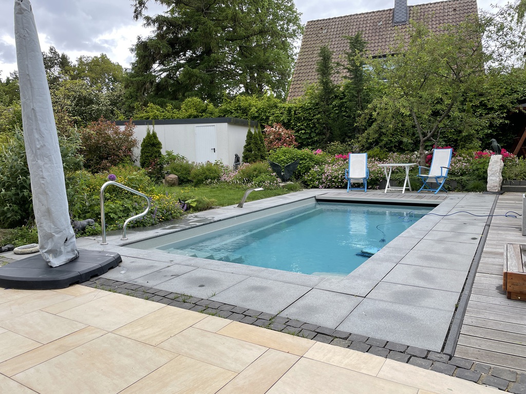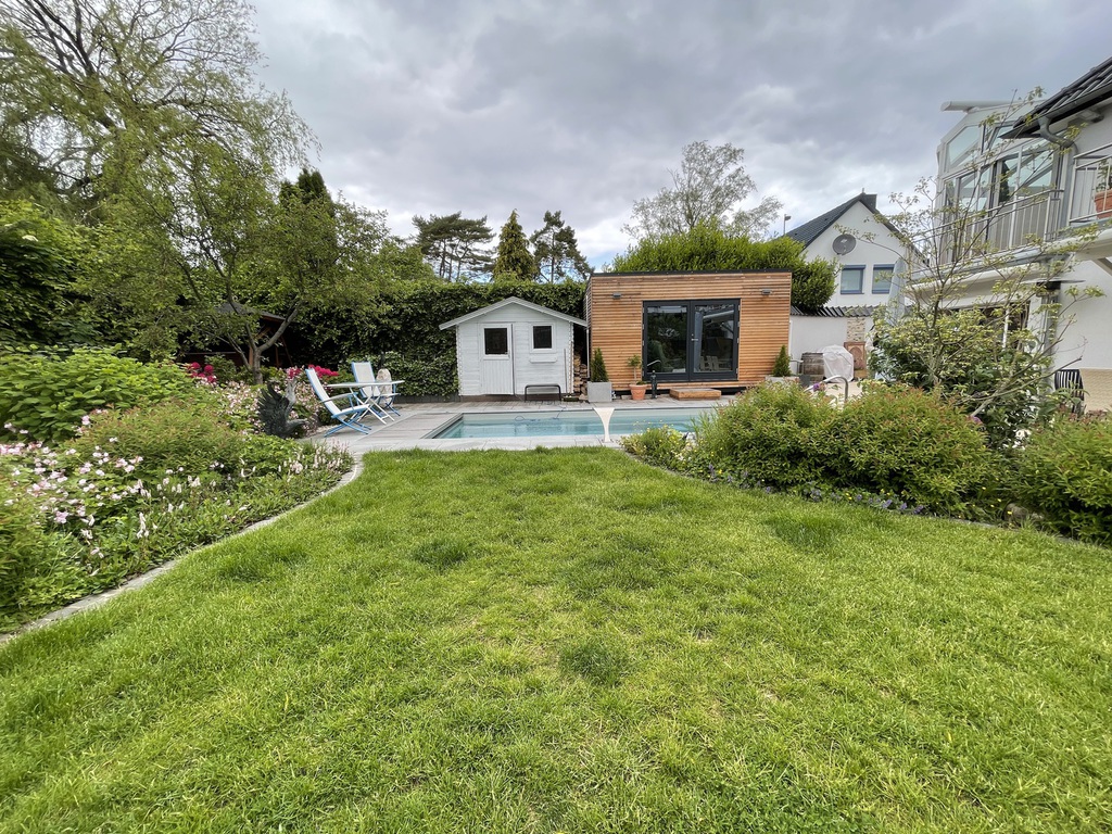 Die großen, bodentiefen Fensterfronten geben den Blick in den neu angelegten Garten und auf den beheizten Pool frei.