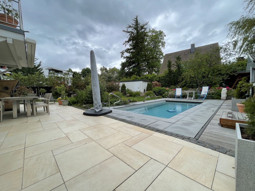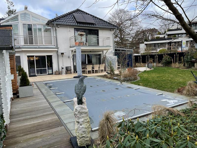 Hier bleiben keine Wünsche offen, Top-Lage, großzügige Räumlichkeiten, hochwertigste Materialien (u.a. Carrara-Marmor, Parket),modernste Technik (Photovoltaik-Anlage, beheizter Pool) Wintergarten, Wellnessbereich, Eigenland-Grundstück