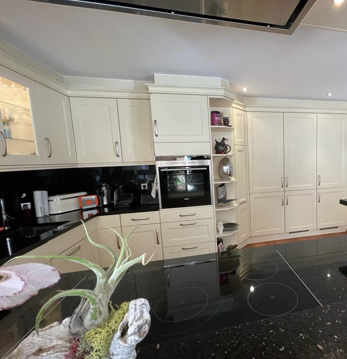 Die weiße Einbauküche, im Landhausstil bietet großzügige Arbeitsflächen (schwarze Granit-Arbeitsplatten), modernste Einbaugeräte und große Staumöglichkeiten. Offen gestaltete, in U-Form, ist sehr