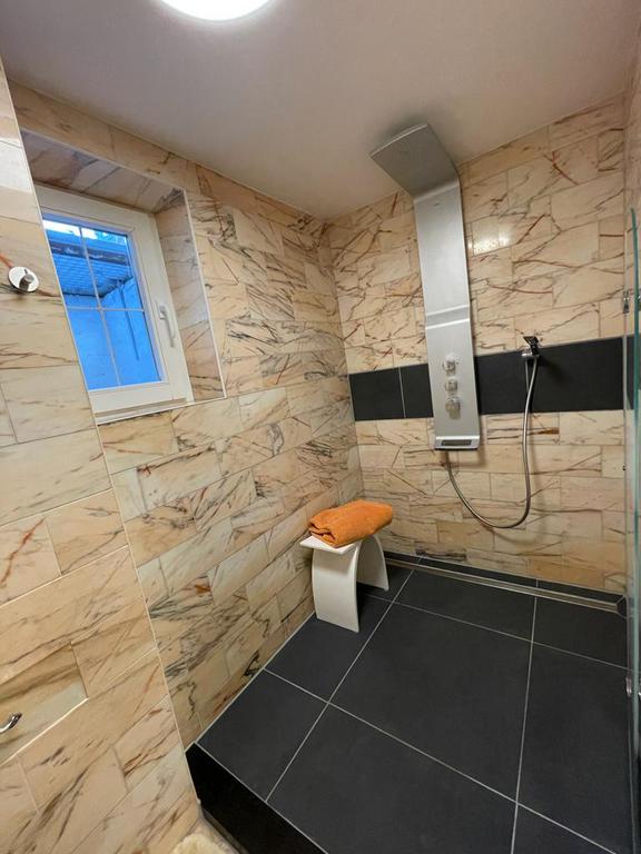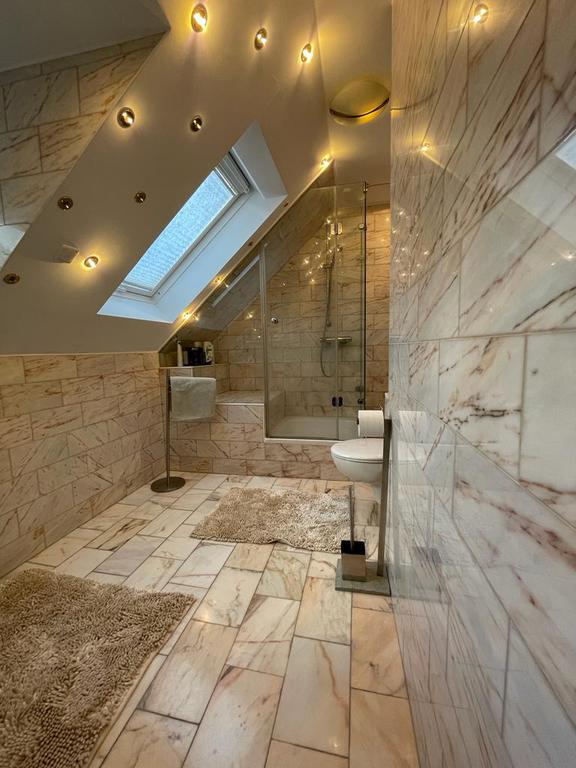 Alle Bäder und das gesamte Kellergeschoß sind mit hochwertigem Carrarar-Marmor ausgelegt , der die luxuriöse Ausstattung des Hauses widerspiegelt.