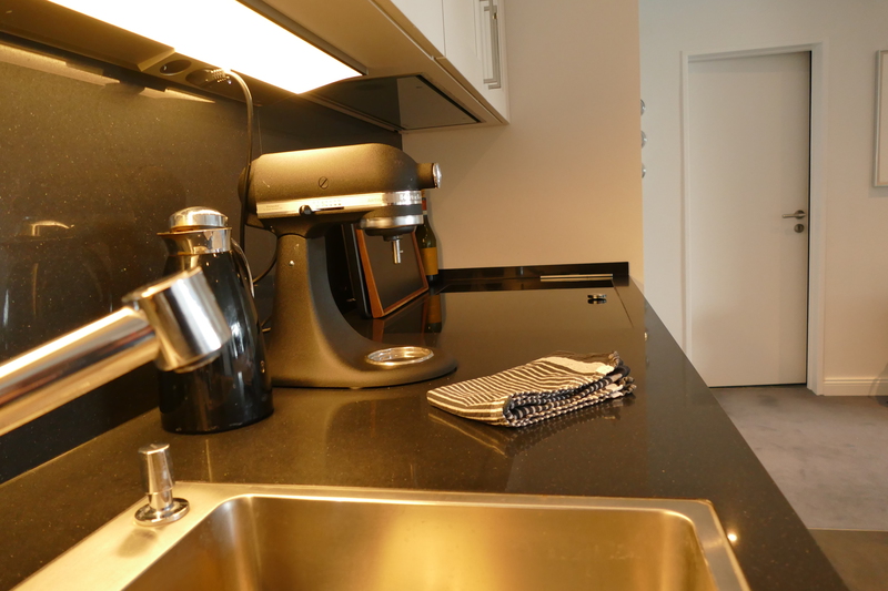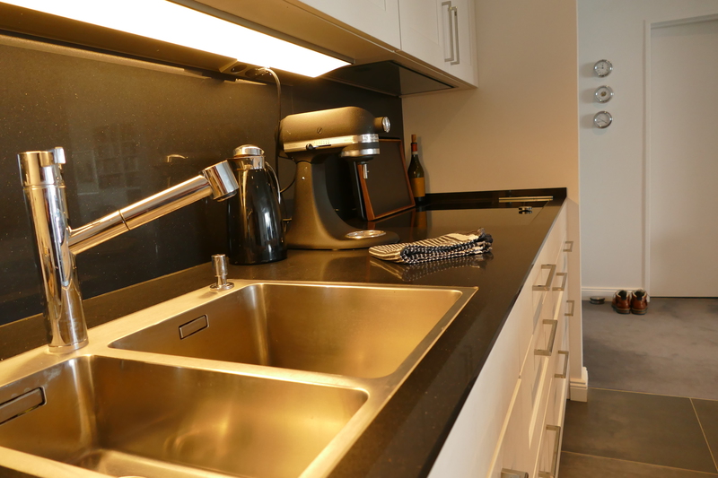 In den großzügigen Wohnraum wurde die weiße Siematic Küche eingebaut, die eine anthrazitfarbene Granit-Arbeitsplatte kontrastreich schmückt. Die hochwertigen Elektrogeräte stammen aus dem Hause