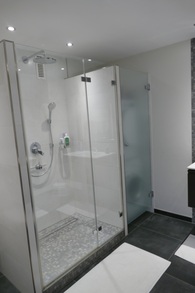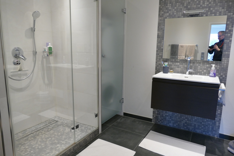 Das Duschbad verfügt über zwei Waschtischanlagen, eine großzügig bemessene Duschkabine, die mit Glaswänden umbaut ist und ein WC. Waschmaschine und Trockner verbergen sich hinter einer Milchglaswand