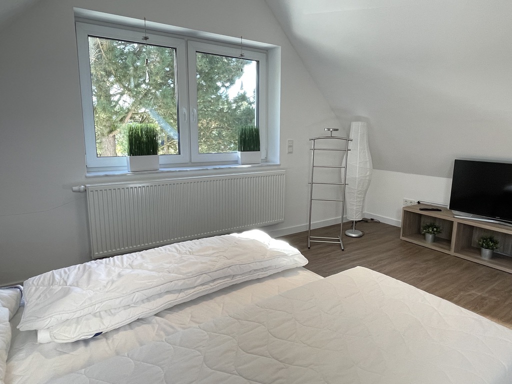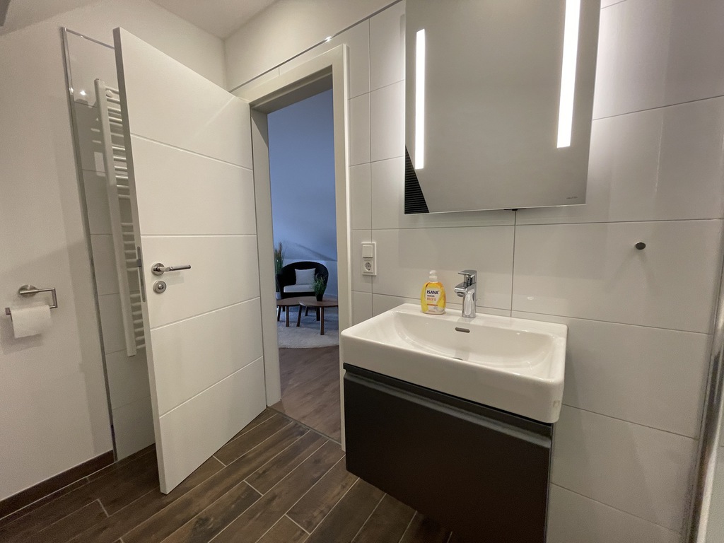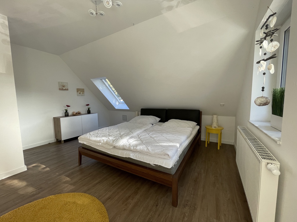 Auf der Ebene finden Sie darüberhinaus ein sehr großes Schlafzimmer und ein modernes Tageslicht-Bad, das mit einer ebenerdigen Dusche und einer Badewanne ausgestattet ist.