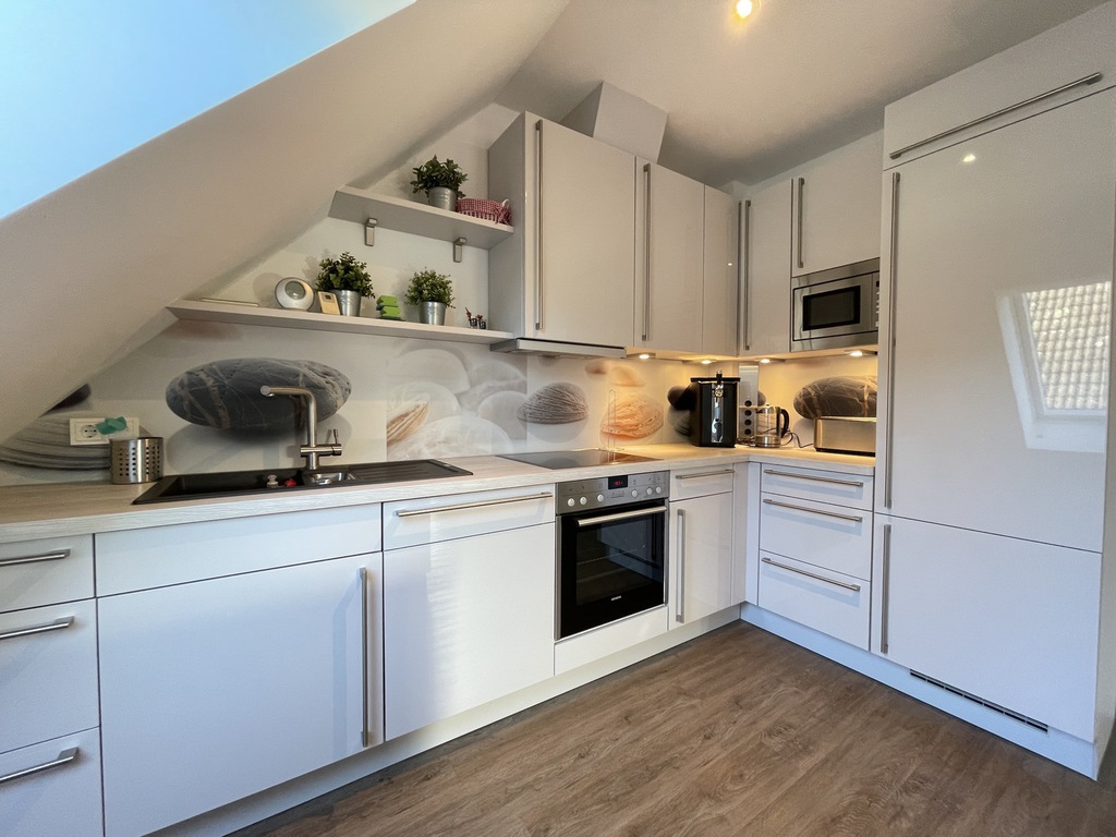 Die moderne Nobilia-Einbauküche wurde in den Wohnraum integriert und bietet Komfort , optimale Arbeitsflächen und viel Stauraum. So verfügt die Küche u.a. über eine Geschirrspülmaschine und ein