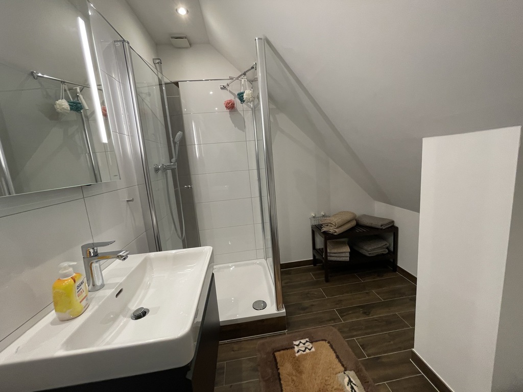 Die obere Etage ist bequem über eine Massivholztreppe erreichbar. Hier finden Sie ein weiteres Schlafzimmer, das problemlos in 2 Zimmer unterteilt werden könnte und ein zusätzliches Tageslicht-Duschbad. Die Bäder verfügen über hochwertige Laufen Armaturen und Badkeramik und tragen zum Komfort bei.