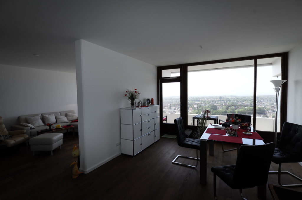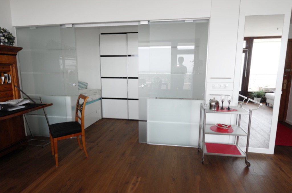 Die Eigentümer haben die Wohnung saniert und den Grundriss grundlegend modifiziert. Es entstand eine offene Wohnung mit einer großzügigen Wohnraumgestaltung. Das Schlafzimmer ist mit Glasschiebetüren