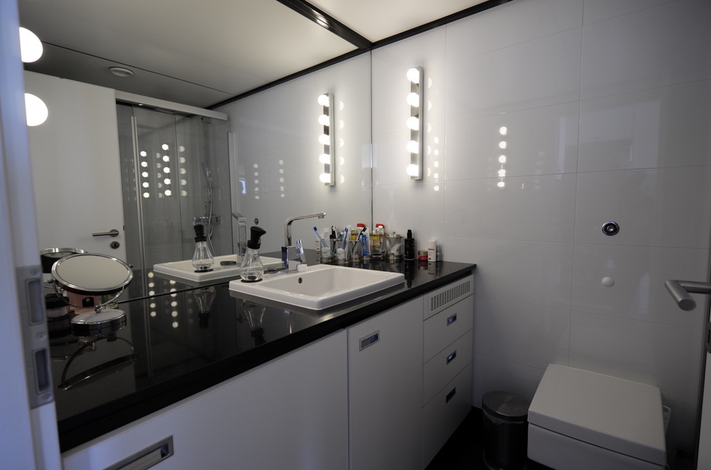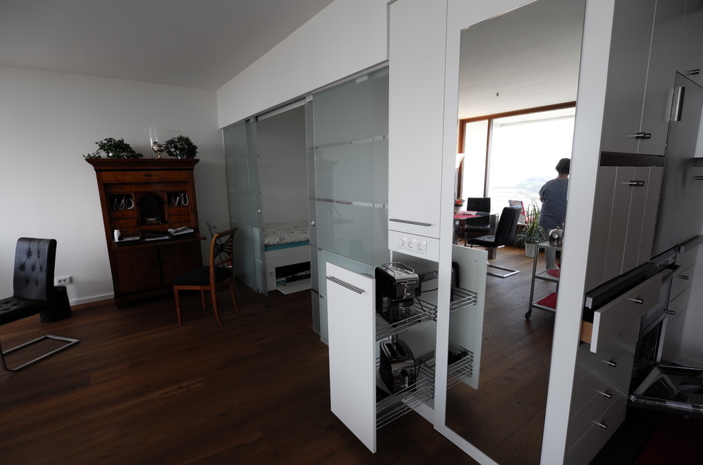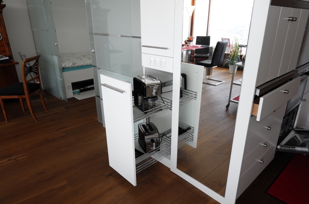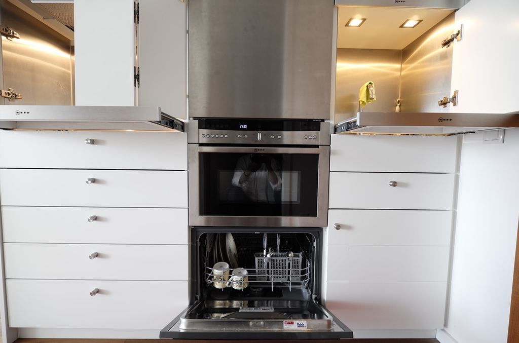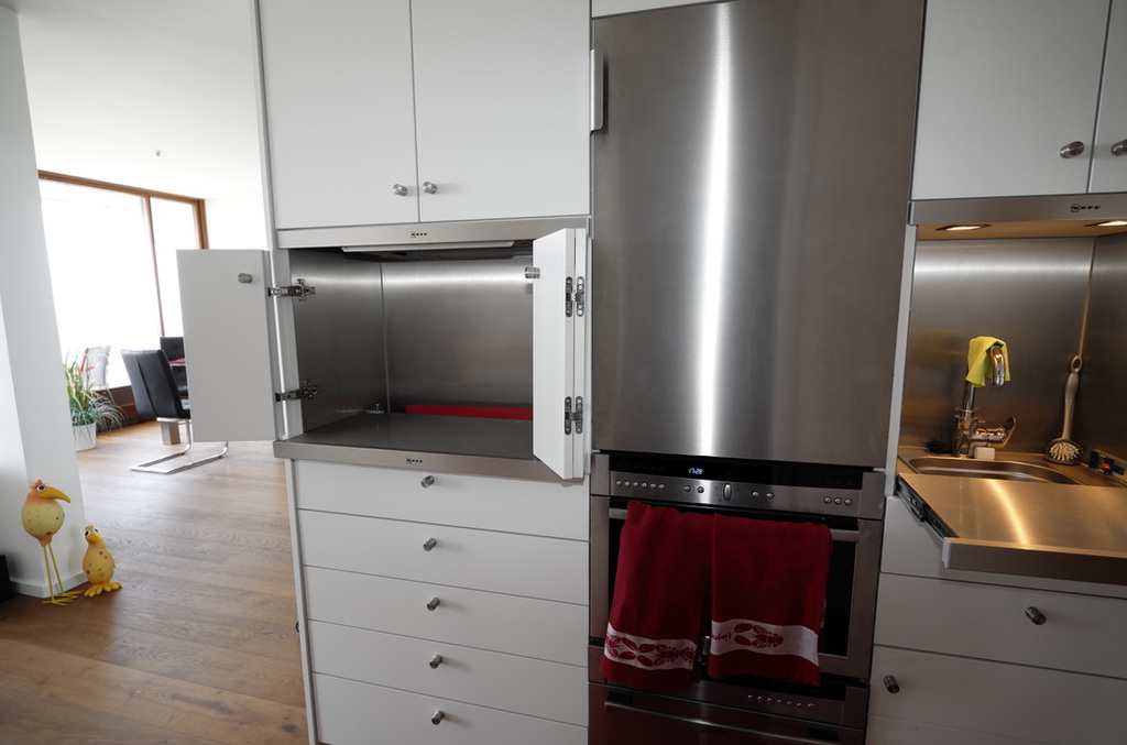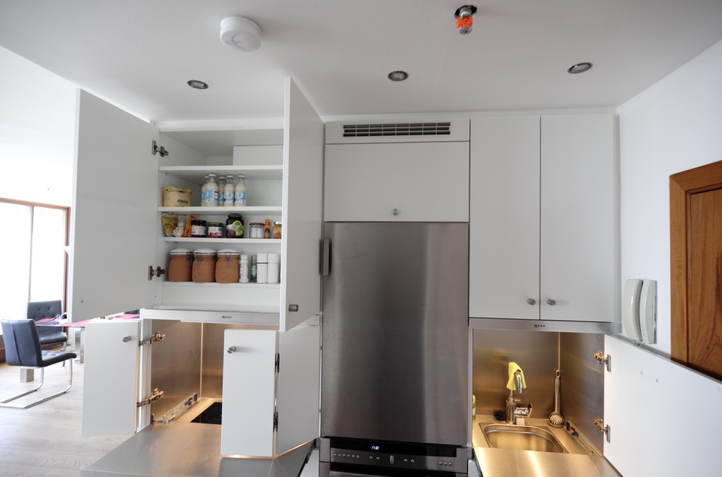 Sie befindet sich, verborgen hinter Schranktüren. In die Einbauküche wurden ein Induktionskochfeld, eine Mikrowelle, eine kleine Geschirrspülmaschine und genügend Stauraum für Geschirr etc.