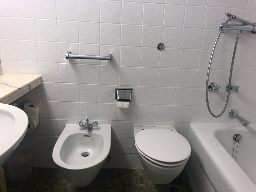 Das helle Bad verfügt über eine niedrige Badewanne, einen Marmorwaschtisch mit integriertem Waschbecken, ein WC und ein Bidet.