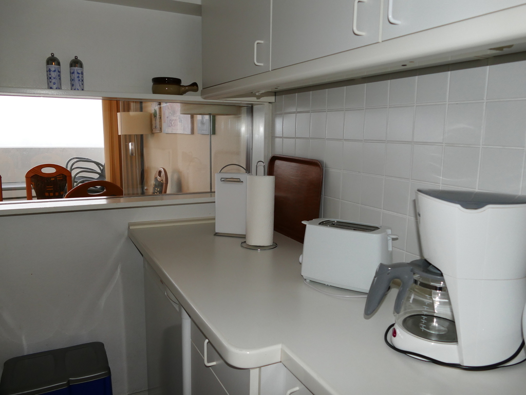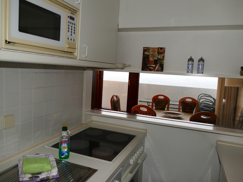 Abgetrennt vom Wohn- Essraum wurde die Einbauküche mit einer Durchreiche zum Esstisch gestaltet.