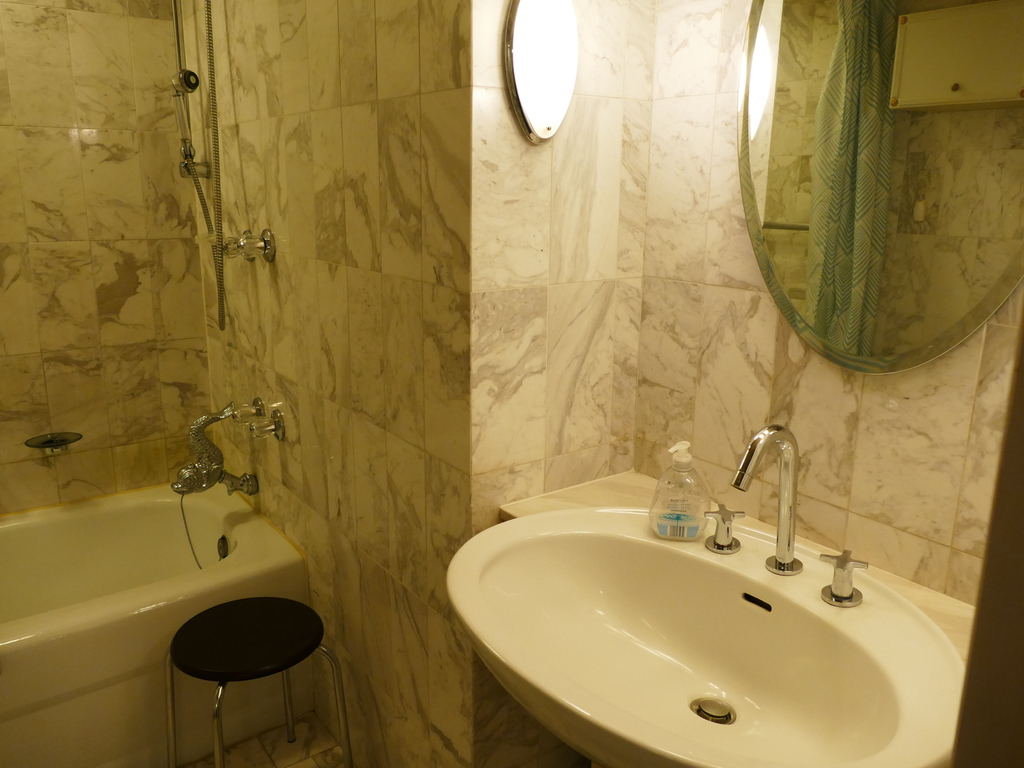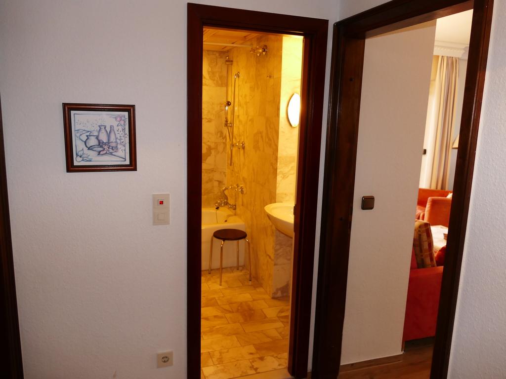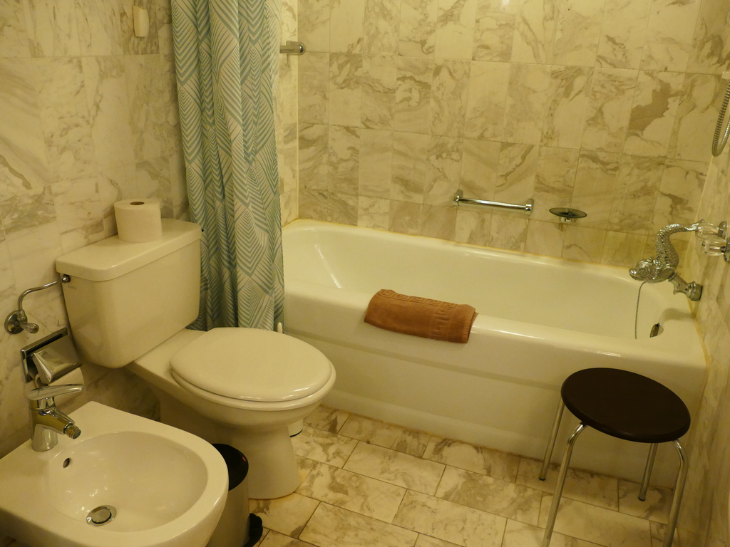 Das Bad verfügt über eine Badewanne, WC, Waschtisch und ein Bidet und eine sehr harmonische, edel wirkende Ausstrahlung.