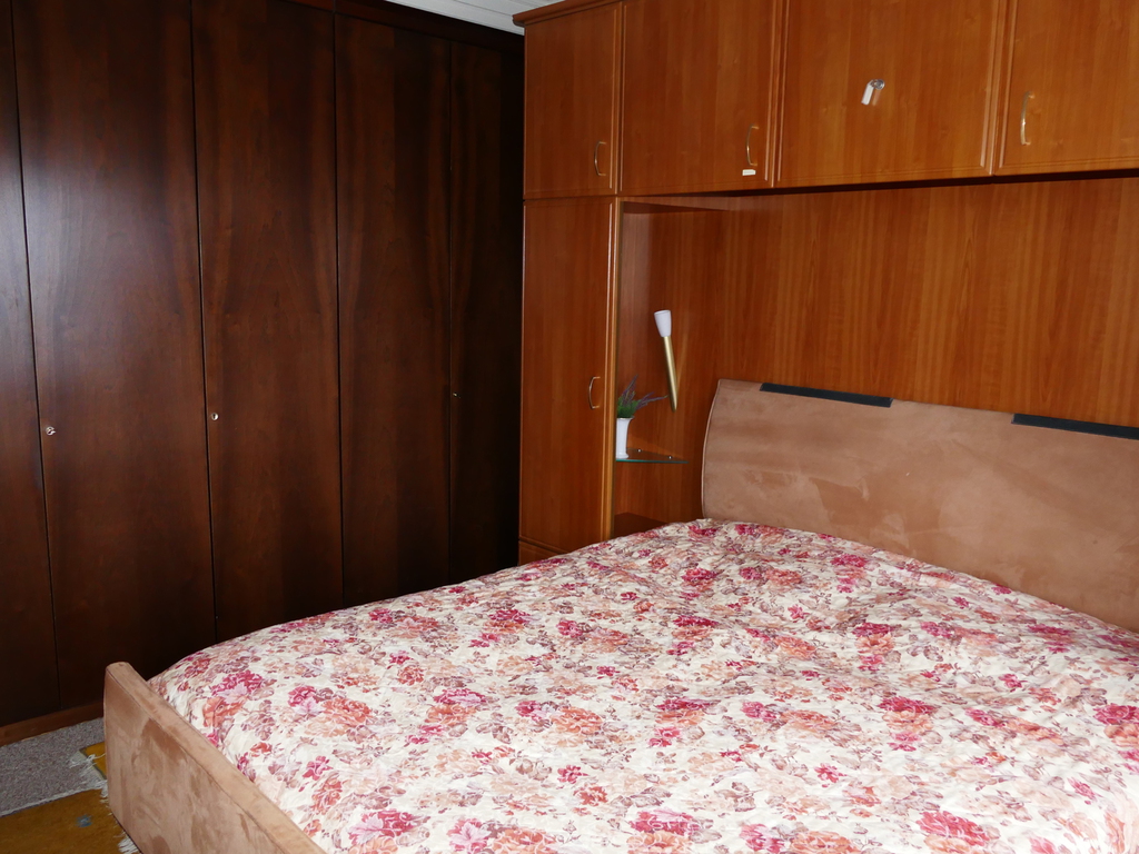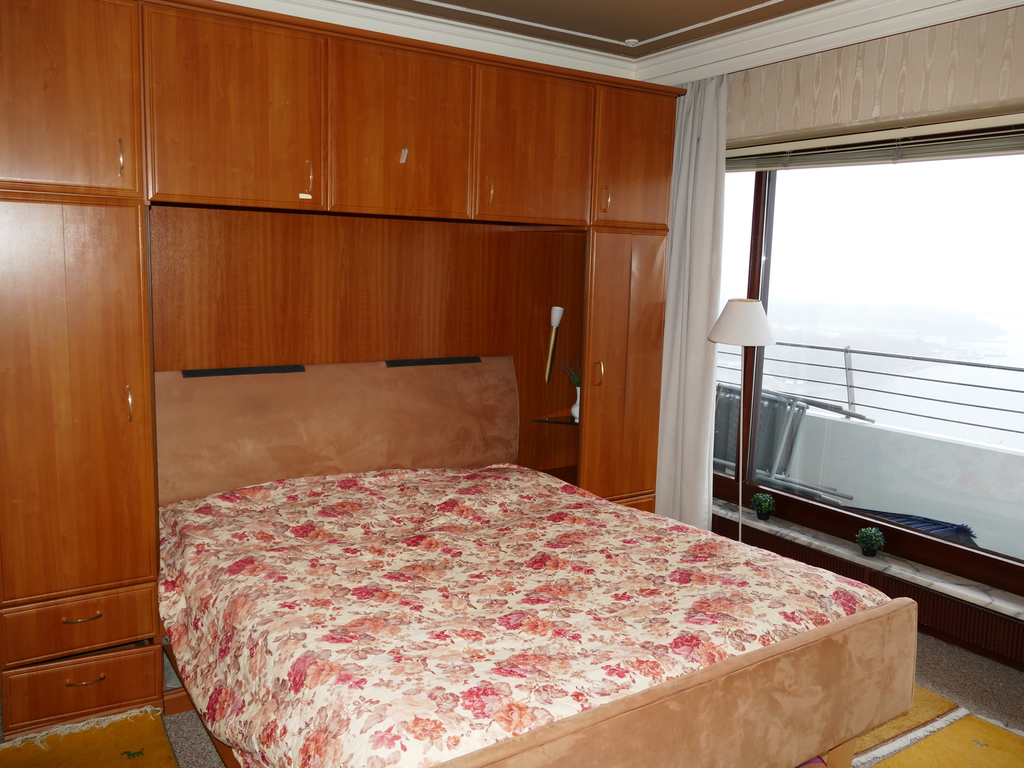 Im Schlafzimmer, das einen direkten Zugang zum umlaufenden Balkon hat und zur Trave ausgerichtet ist befindet sich ein geräumiger Einbaukleiderschrank, der genügend Stauraum bietet.