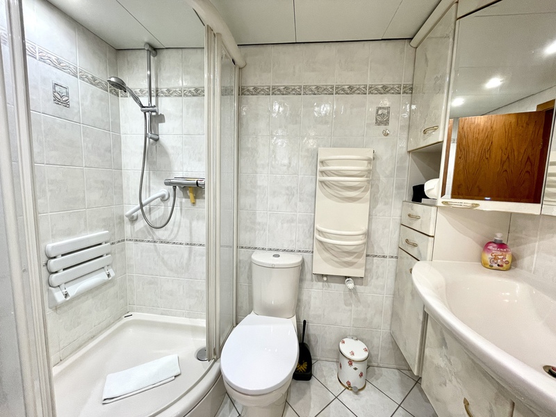 Die Wohnung befindet sich in einem gepflegten Zustand und verfügt über ein elegantes, weiß gefliestes Duschbad, das auch über einen Waschtrockner verfügt um einen dauerhaften bzw. längeren