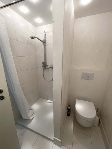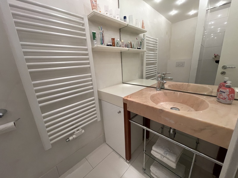 Das moderne, sehr komfortable Duschbad verfügt über eine bodentiefe Dusche, einen schönen Waschtisch und ein WC. Hell gefliest nimmt es den Charakter der Wohnung auf.