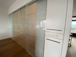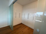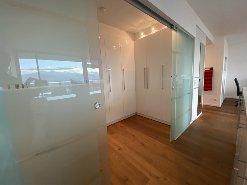 Mit Glasschiebetüren vom Wohn und Schlafraum getrennt wurde ein Ankleidezimmer geschaffen, das mit deckenhohen Einbauschränken möbliert ist, die ausreichend Platz bieten.