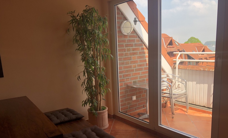 Die bodentiefen Fenster lassen Licht einströmen und bei geöffneten Balkontüren wird der Übergang zum Balkon fließend und die Trave ist zum Greifen nah.