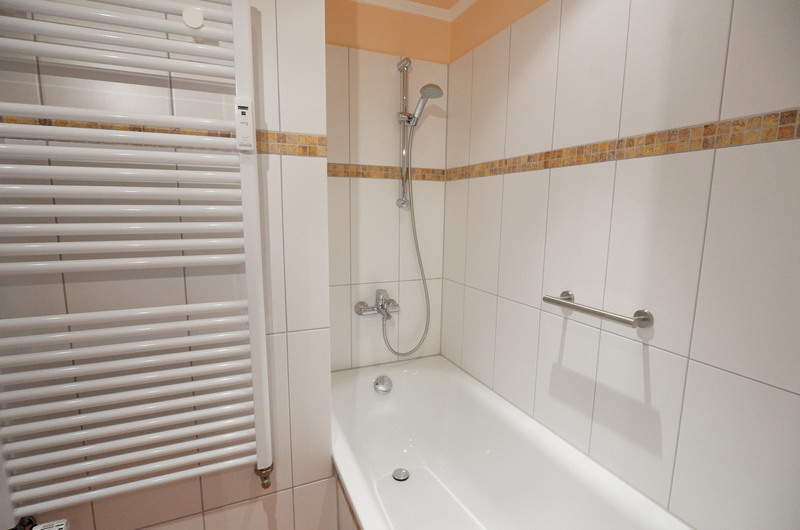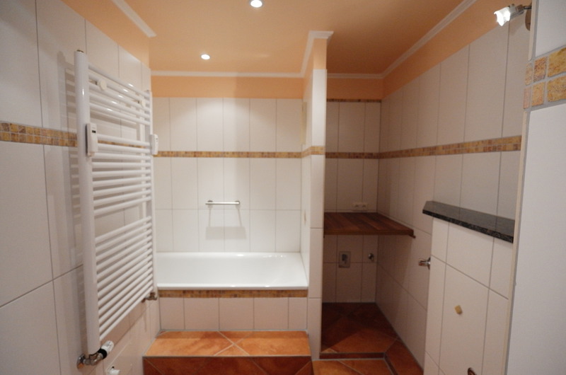 Auf der Ebene des Wohnbereichs befindet sich das großzügige Badezimmer, das eine große Wanne mit Duschmöglichkeit bietet. Platz und Anschlüsse für eine Waschmaschine sind vorhanden. Die Anschlüsse