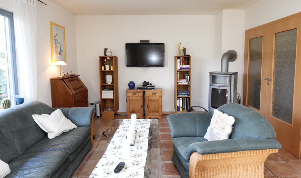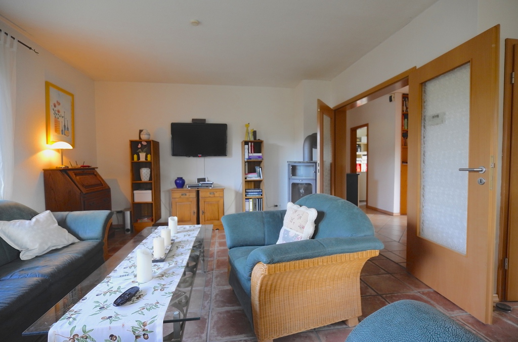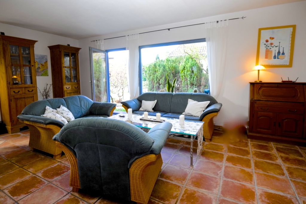 Vom Wohnzimmer aus haben Sie Zugang zu dem pflegeeicht angelegten Garten und der überdachten Terrasse. Der Süd-Westausrichtung verdankt das Haus die helle, freundliche Atmosphäre.