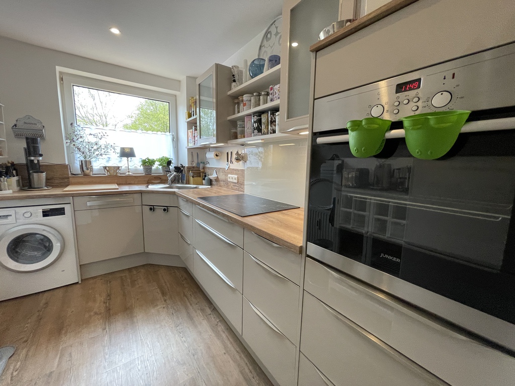 Mit beige farbenen Hochglanz-Fronten ist die Einbauküche ausgestattet, die über ein großes Induktions-Kochfeld, eine Geschirrspülmaschine, einen Backofen und eine Waschmaschine verfügt. Die
